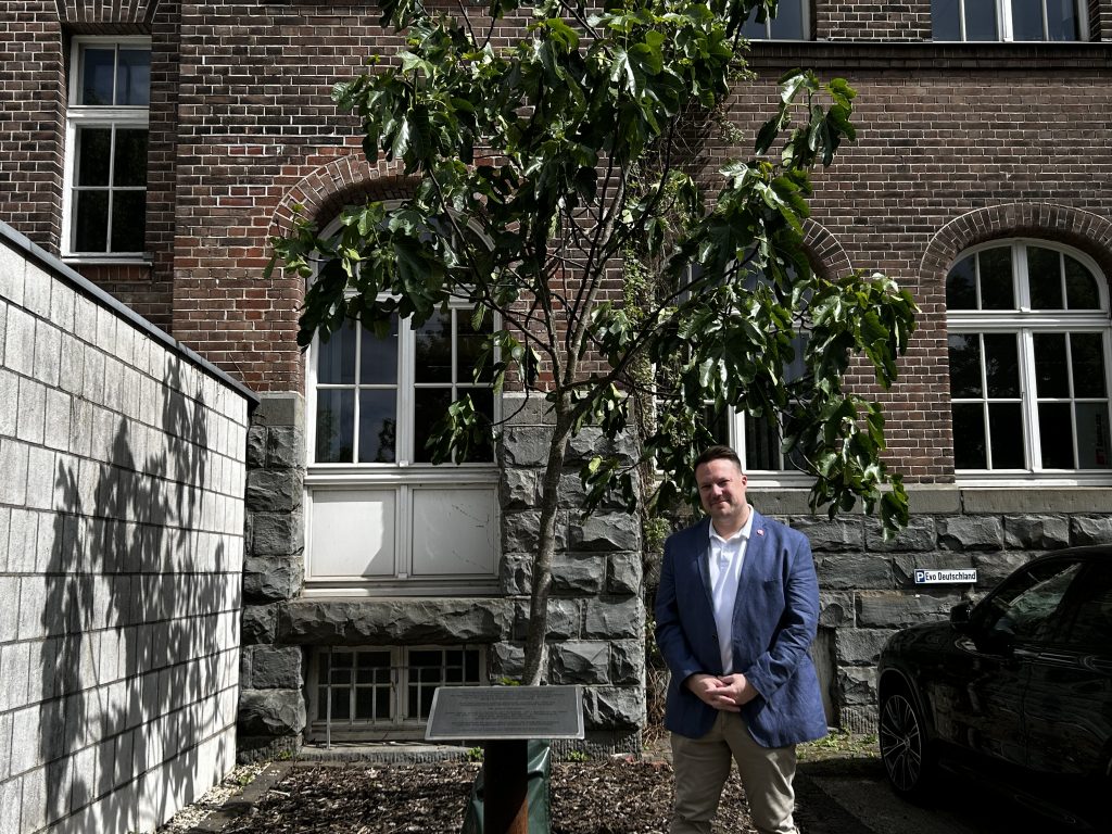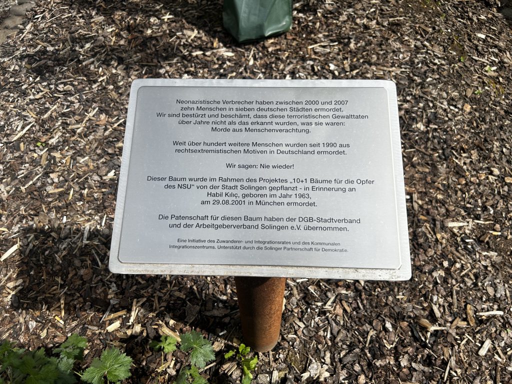 Die Patenschaft für den Baum haben der Arbeitgeberverband und der Deutsche Gewerkschaftsbund (DGB) Solingen übernommen. Auf dem Foto steht Yanick Guth, Vorstandsmitglied des DGB, vor dem Habil Kılıç gewidmeten Baum.